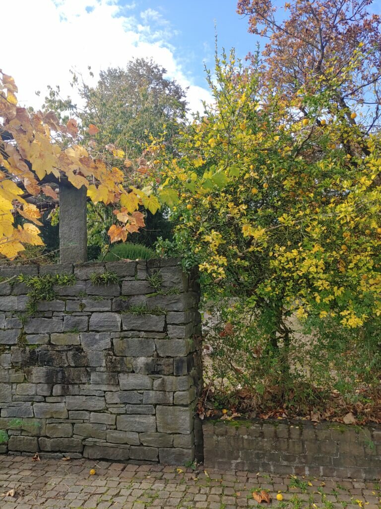Ein gut vier Meter hoher Orangenbaum im Freiland. Poncirus trifoliata, die Bitterorange, das Stadtklima und der Rhein erschaffen wohl wärmere Winter.