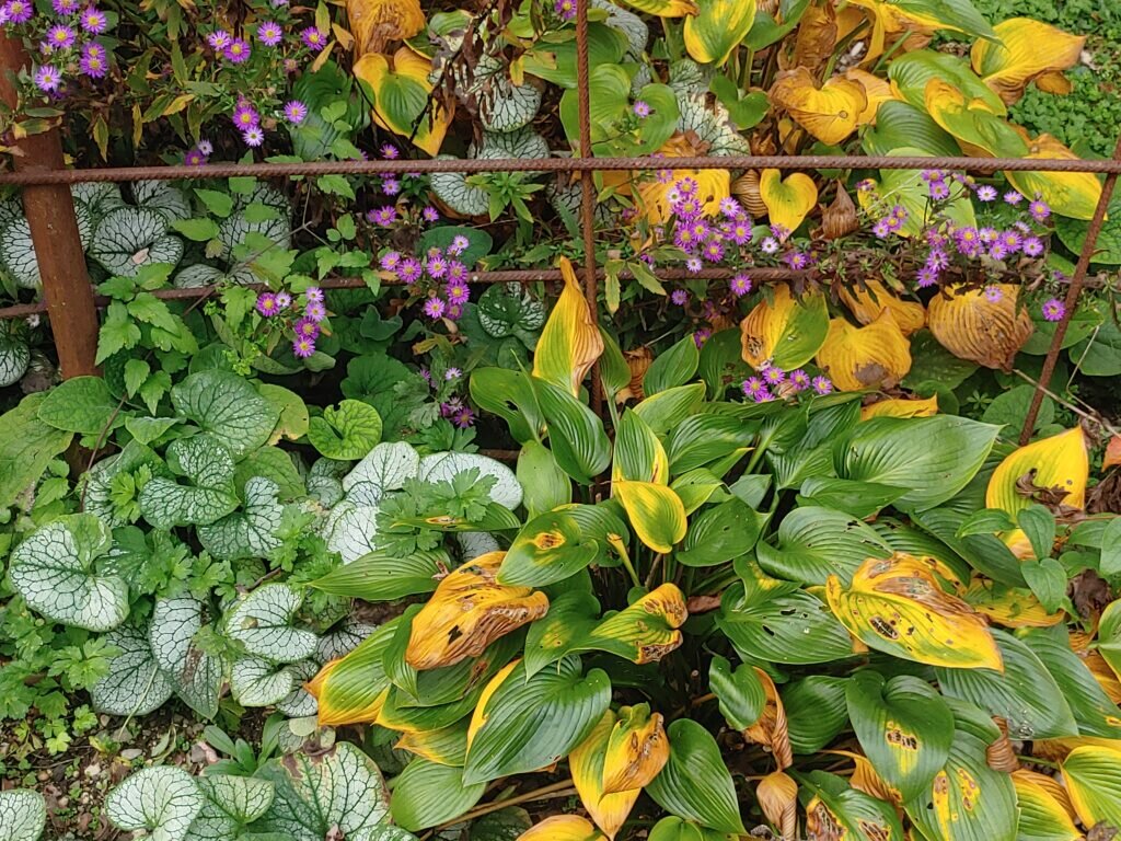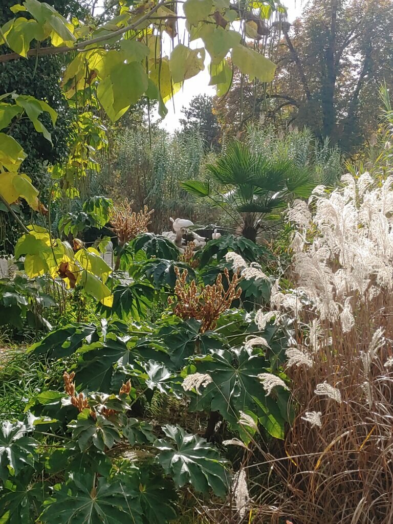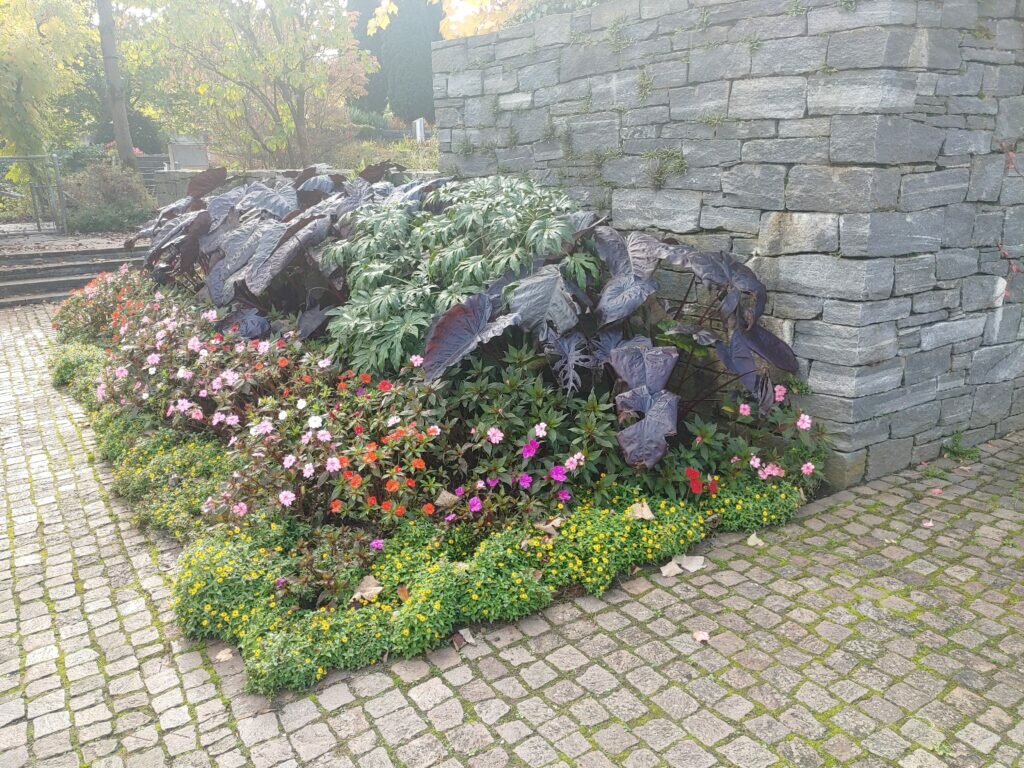 Die dunklen großen Blätter stammen von Colocasia esculenta ‚Royal Hawaiian‘ oder ‚Black Coral‘. Die möchte ich auch im Garten haben