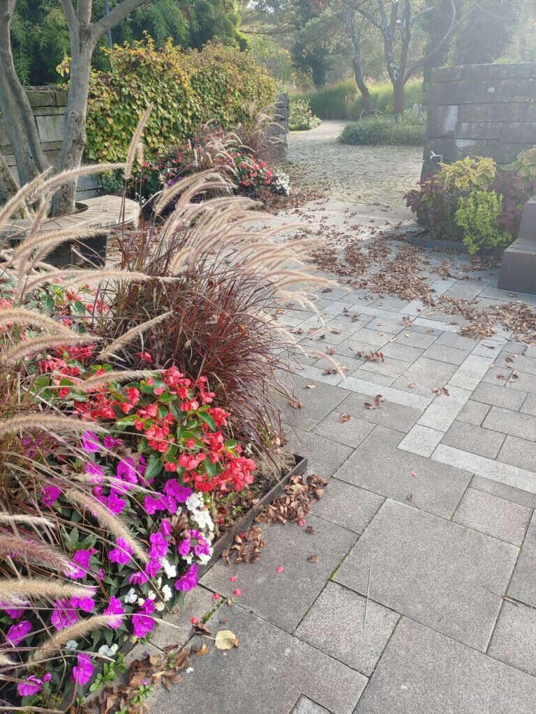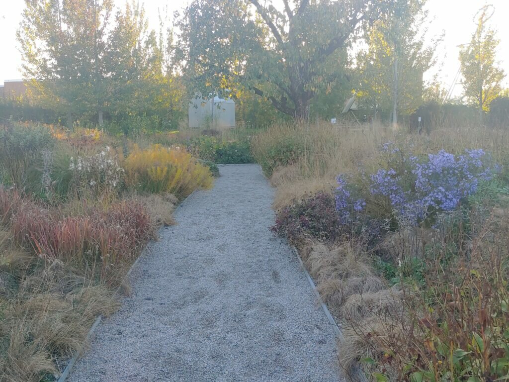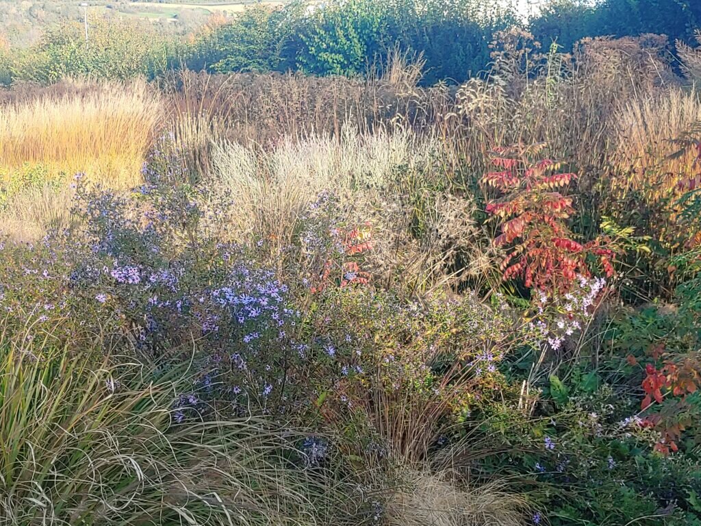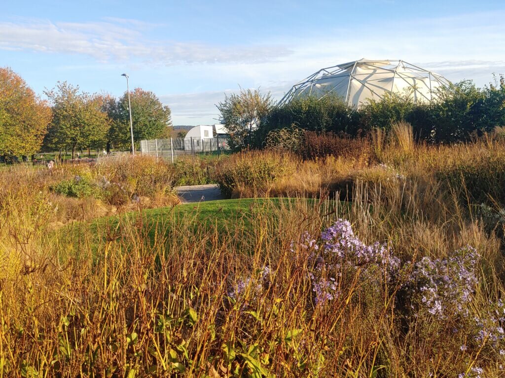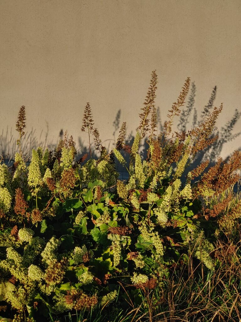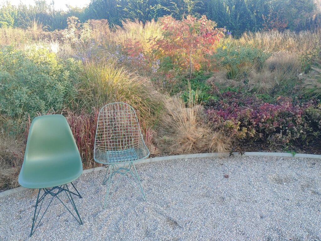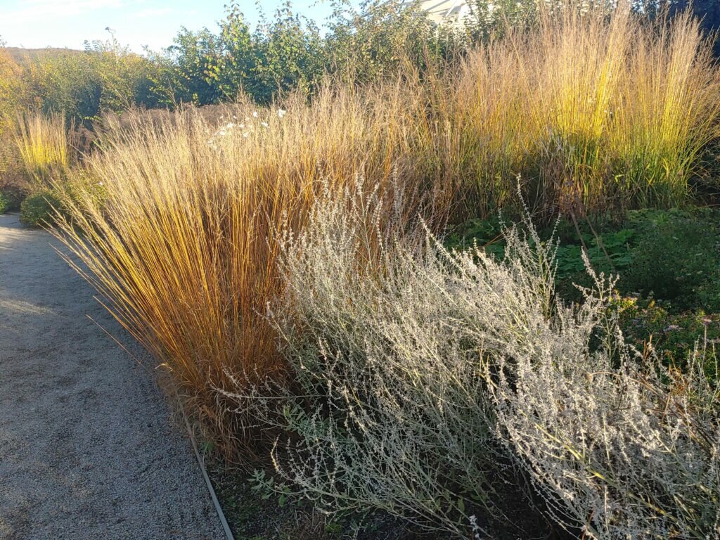 Hauptanziehungspunkt für mich war der zum Designmuseum zugehörige „Garten von Piet Oudolf“, einem niederländischen Gärtner und Gestalter, dessen Spezialität prärieähnliche Gärten sind, mit in Gruppen (!) gepflanzten Schaupflanzen. Deren Herbstcharakter ist das wesentliche Designelement. Im Sommer eher uninteressant (in Wisley gesehen und abgehakt), im Herbst spannend und bei untergehender Sonne in den Farben schön: