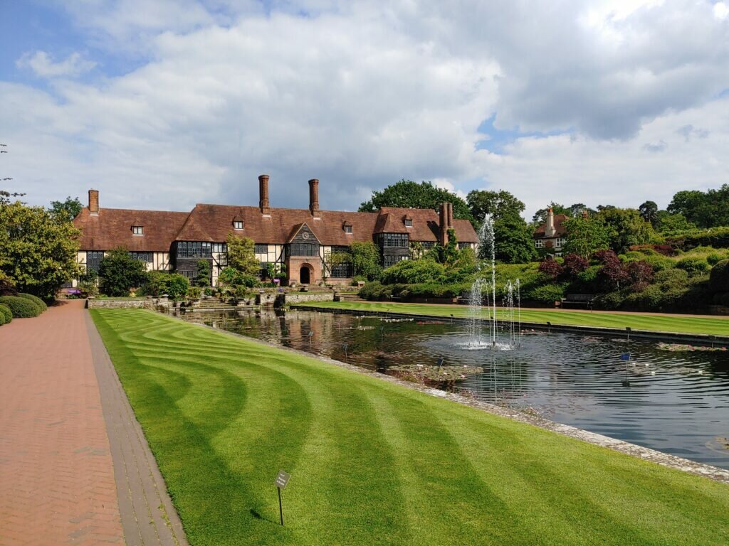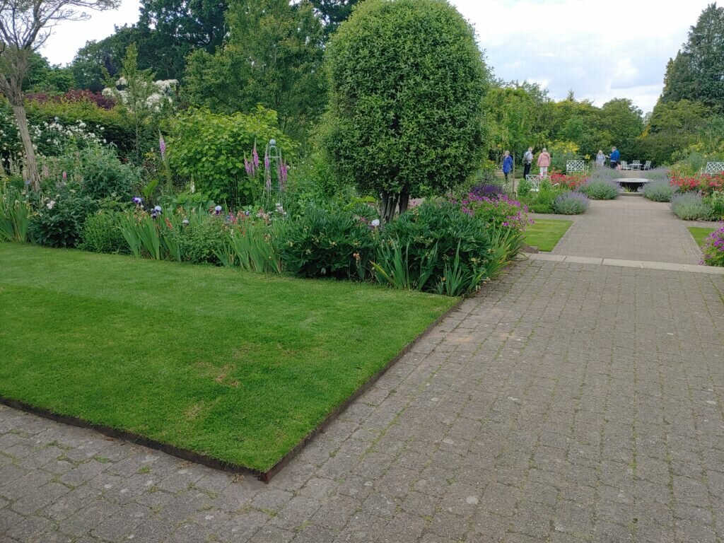 Die Kunst, Englischen Rasen zu pflegen: Das Gras wird etwa 15 mm ausschliesslich mit einem Spindelmäher gekürzt, am Mähgerät hinten dran ist eine zusätzliche Walze (Walzenmäher), die das Gras etwas umlegt, wodurch die charakteristischen Streifen sichtbar werden sofern man in 2 Richtungen fährt (schafft man mit einem „gewöhnlichen“ Kreiselmäher nicht so gut). Nach dem Mähen wird beregnet, weil das Gras durch die Schnittflächen Feuchtigkeit verliert, anschließend je nach Wetterlage mit einer Bürstenwalze getrocknet (und gleichzeitig vertikutiert = abgestorbene Halme ausgekämmt), damit sich kein Grasschimmel bildet (woraus Flecken resultieren könnten) oder der Rasenboden wird mit einer Stachelwalze belüftet und besandet, usw. Der feine englische Nieselregen (Steigungsregen aus wasserdampfgesättigter Luft) bewirkt, dass der Rasen gut gedeiht und nicht gelb ode (igitt) gar braun wird.
