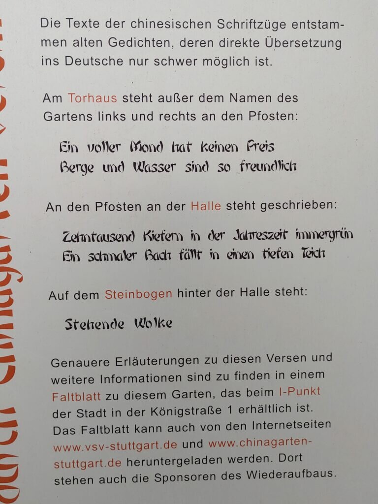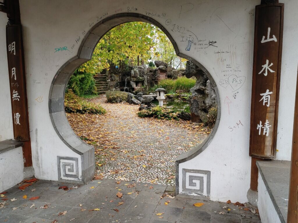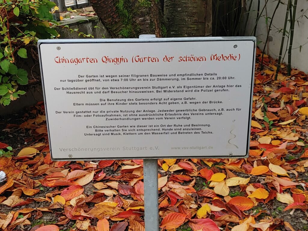 Stuttgart hat einen Chinesischen Garten. Den musste ich sehen. 15 Gehminuten von meinem Quartier entfernt, halb auf einem der zahlreichen Hügel, von denen Stuttgart umgeben ist (der Routenplaner zeigt die Höhen leider nicht an).